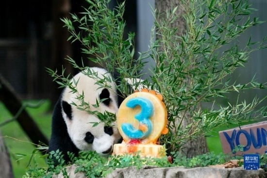8月21日,大熊貓幼崽“小奇跡”在美國首都華盛頓史密森學會國家動物園享用生日蛋糕。新華社記者 劉杰 攝
