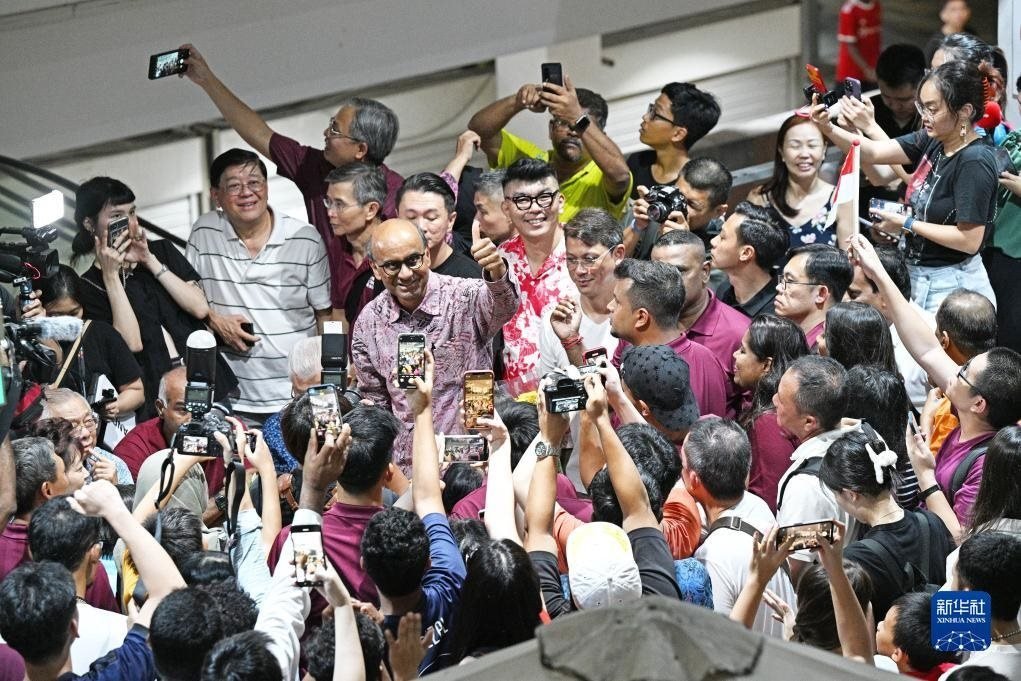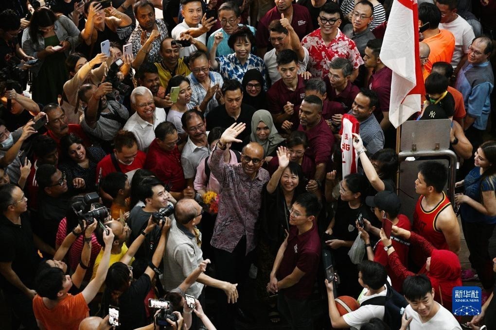 9月1日,新加坡總統(tǒng)候選人尚達曼(中)在裕廊等待總統(tǒng)選舉結果揭曉時向支持者致意。新華社發(fā)(鄧智煒攝)