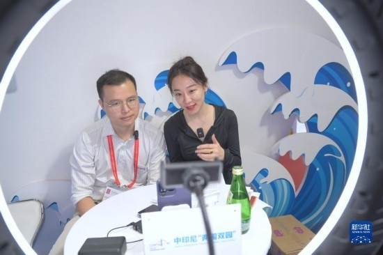 工作人員在第二十三屆中國國際投資貿(mào)易洽談會(huì)中印尼“兩國雙園”展位開展直播活動(dòng)(9月9日攝)。