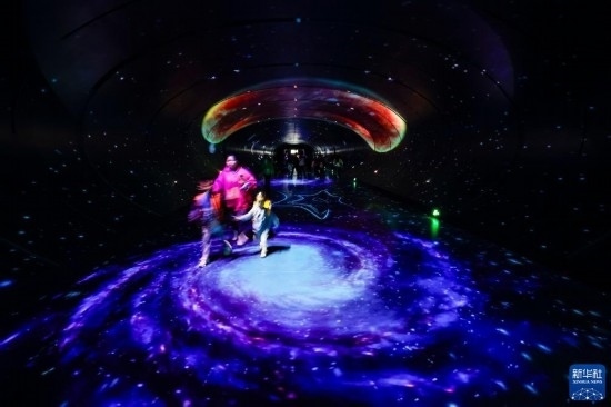 10月18日,在第81屆世界科幻大會(huì)主場(chǎng)館——成都科幻館內(nèi),人們走在“時(shí)空隧道”內(nèi)。
