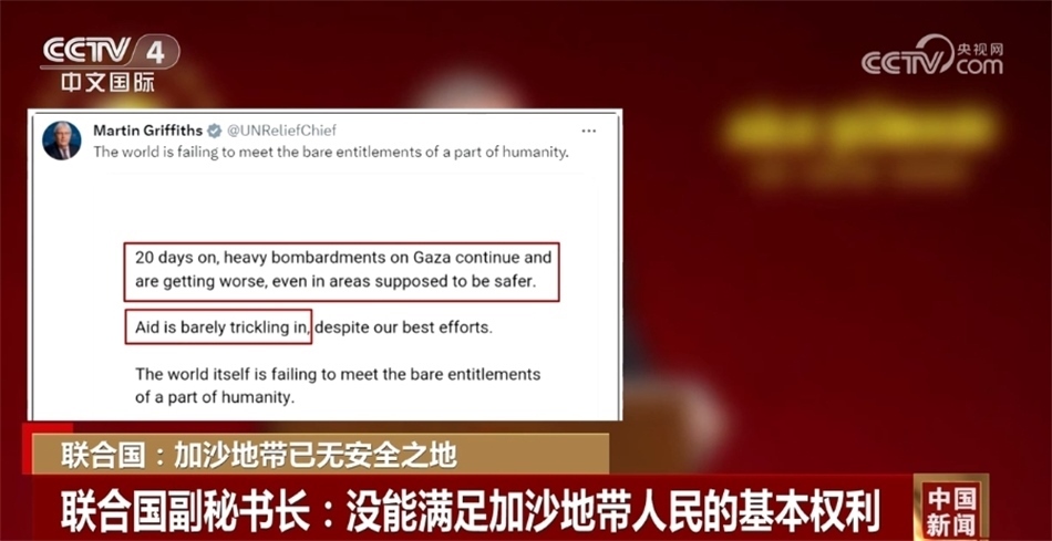 同一天,聯(lián)合國分管人道主義事務(wù)的副秘書長馬丁·格里菲斯在社交媒體發(fā)文稱,在過去20天里,對加沙地帶的猛烈轟炸愈發(fā)嚴重,一些本該安全的地區(qū)也已經(jīng)陷入危險,但援助物資卻很難進入加沙地帶,國際社會沒能滿足一部分人的基本權(quán)利。
