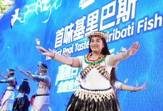 11月8日,來自基里巴斯的參展人員在基里巴斯水產(chǎn)品推介活動上表演。