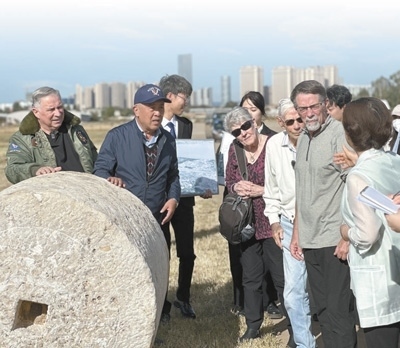 在云南昆明呈貢機(jī)場舊址,代表團(tuán)一行聆聽講解員講述石碾背后的故事。呈貢機(jī)場曾是飛虎隊(duì)在昆明的主要基地之一,機(jī)場建設(shè)期間,當(dāng)?shù)厝嗣窭瓌?dòng)巨大石碾平整跑道,付出艱苦努力。本報(bào)記者 劉玲玲攝