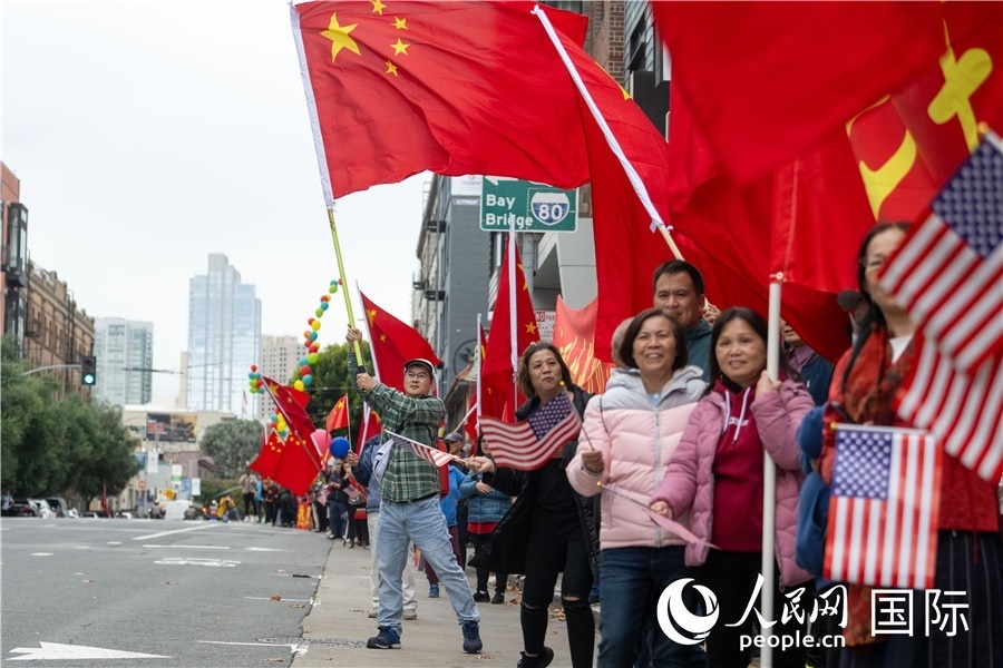 習(xí)近平乘坐的車隊(duì)離開機(jī)場前往下榻飯店途中,許多華僑華人和中國留學(xué)生代表等候在沿途街道,揮舞中美兩國國旗,熱烈歡迎習(xí)近平主席到訪。