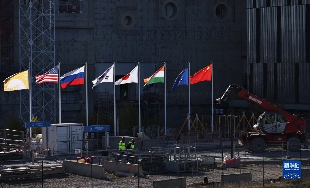 ?11月24日,在位于法國圣保羅-萊迪朗斯的國際熱核聚變實(shí)驗(yàn)反應(yīng)堆(ITER)的建造廠房外,中國、歐盟、印度、日本、韓國、俄羅斯、美國七個(gè)參與方的旗幟和ITER組織的旗幟迎風(fēng)飄揚(yáng)。新華社記者 高靜 攝