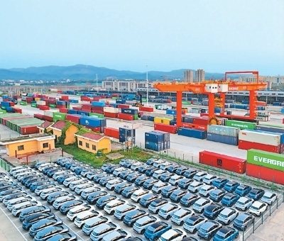 11月28日,在位于江西省贛州市南康區(qū)的贛州國(guó)際陸港,比亞迪新能源汽車將通過(guò)鐵路運(yùn)送至深圳鹽田港出口國(guó)外。