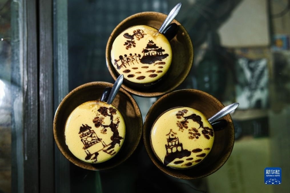 這是2023年7月22日在越南河內(nèi)一家咖啡店拍攝的繪制河內(nèi)風(fēng)光圖案的雞蛋咖啡。越南特色飲品雞蛋咖啡由蛋黃、糖、煉乳和咖啡等原料制成,其獨(dú)特的風(fēng)味受到當(dāng)?shù)孛癖姾屯鈬?guó)游客喜愛。