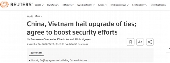 路透社12月13日?qǐng)?bào)道稱,中國(guó)和越南宣布,兩國(guó)簽署了數(shù)十項(xiàng)合作協(xié)議,同意加強(qiáng)安全事務(wù)合作,共同構(gòu)建“命運(yùn)共同體”。
