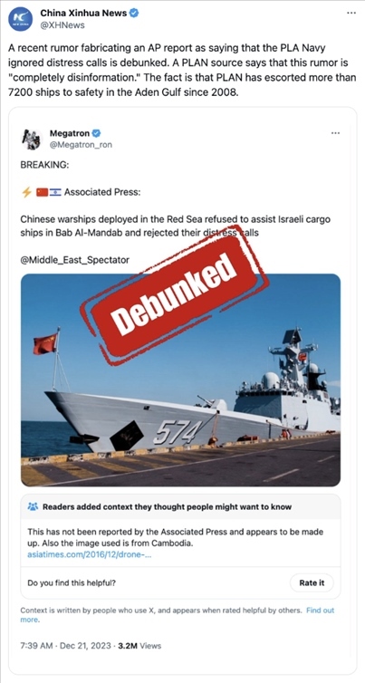一個(gè)名為“Megatron”的擁有十多萬“粉絲”的賬號在社交平臺(tái)“X”(原推特)上說:“美聯(lián)社突發(fā)新聞!中國軍艦在曼德海峽拒絕協(xié)助以色列貨船,且無視他們的呼救?!辟N文后還配了一張中國軍艦的照片。