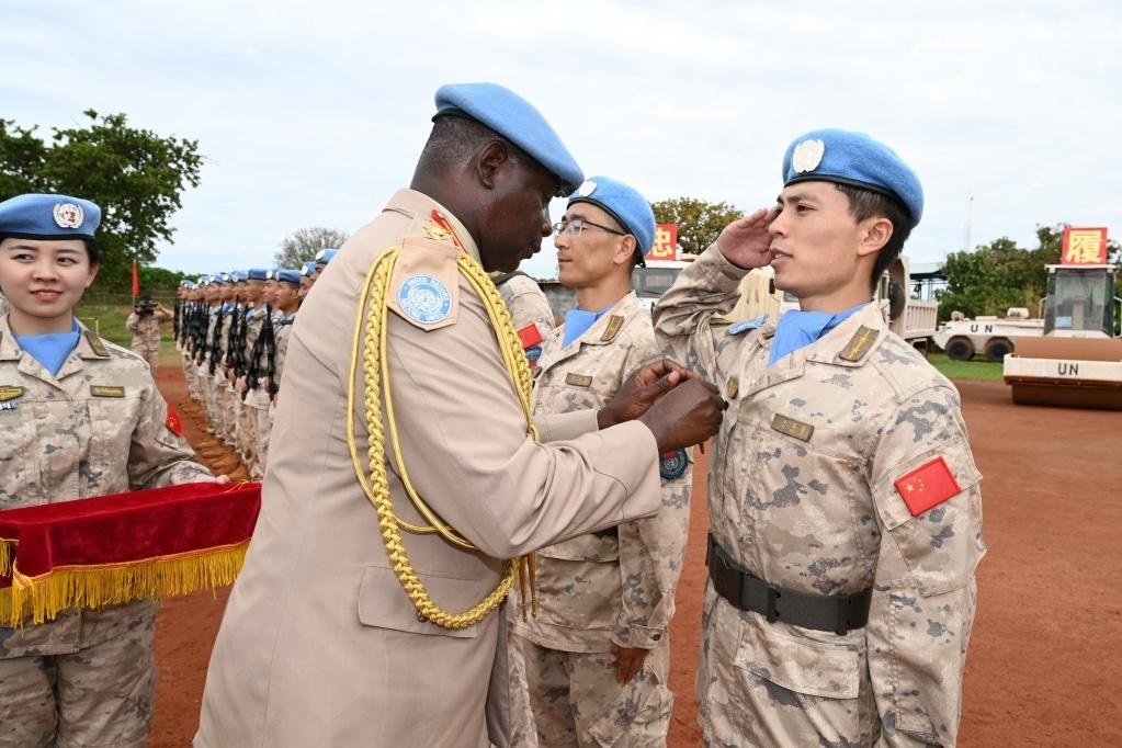 2023年10月28日,在聯(lián)合國駐南蘇丹特派團(tuán)瓦烏超級營地的中國工兵營區(qū),聯(lián)南蘇團(tuán)西戰(zhàn)區(qū)司令哈根(中)在授勛儀式現(xiàn)場授予中國維和官兵聯(lián)合國“和平榮譽(yù)勛章”。新華社發(fā)(李飛宇攝)