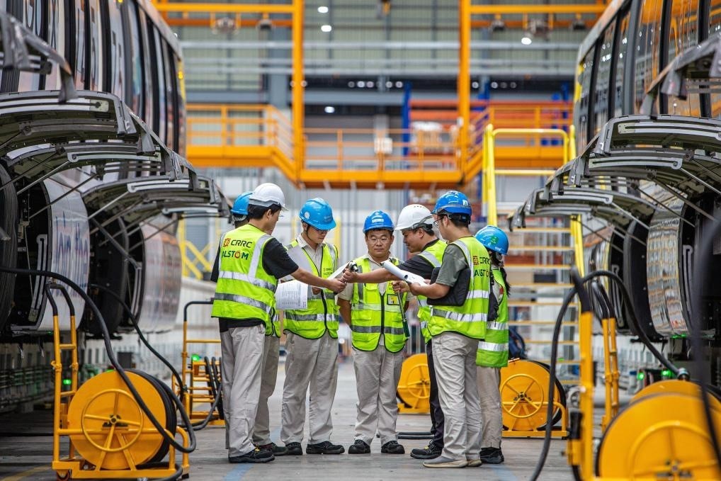 2023年9月22日,在泰國(guó)曼谷“黃線(xiàn)”列車(chē)維護(hù)中心,中車(chē)浦鎮(zhèn)阿爾斯通運(yùn)輸系統(tǒng)有限公司工作人員檢修列車(chē)。新華社記者王騰攝