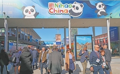 會展中心外側主通道的顯著位置,印有“你好!中國”國家旅游形象圖案的廣告牌。 本報記者 許海林攝