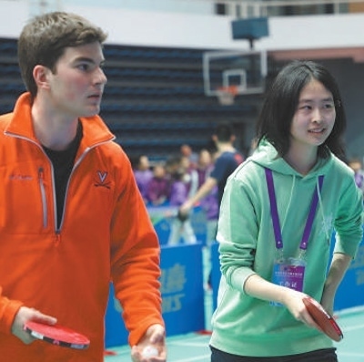 1月6日上午,清華大學(xué)綜合體育館內(nèi),加油聲此起彼伏。來自弗吉尼亞大學(xué)和清華大學(xué)的學(xué)生聯(lián)合組隊(duì),進(jìn)行多輪次乒乓球混合雙打比賽。小小的乒乓球來回穿梭,兩國(guó)青年通力配合,贏得陣陣掌聲。