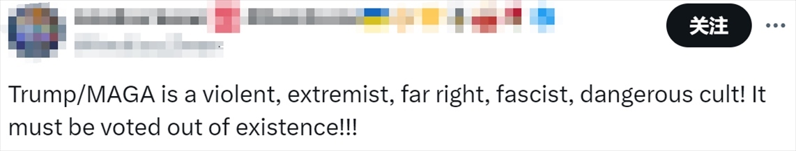 有人喊話:“特朗普/MAGA(即讓美國(guó)再次偉大口號(hào))是一個(gè)暴力的、極端的、極右翼的、法西斯的、危險(xiǎn)的邪教!一定要用投票讓它不復(fù)存在?。?!”