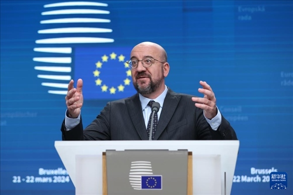 3月21日,在比利時布魯塞爾,歐洲理事會主席米歇爾在歐盟峰會期間出席新聞發(fā)布會。新華社記者 趙丁喆 攝