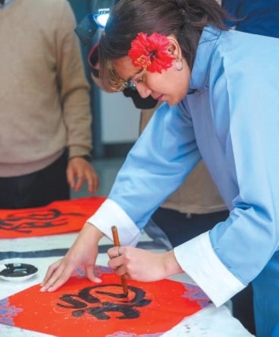 安雅在學(xué)校為留學(xué)生舉辦的新春活動(dòng)上用毛筆書寫“福”字。受訪者供圖
