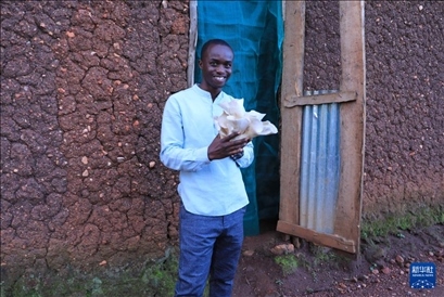 4月6日,在盧旺達南方省穆漢加市附近,尼揚博·奧貝德在工坊展示培育的蘑菇。 新華社記者 董江輝 攝
