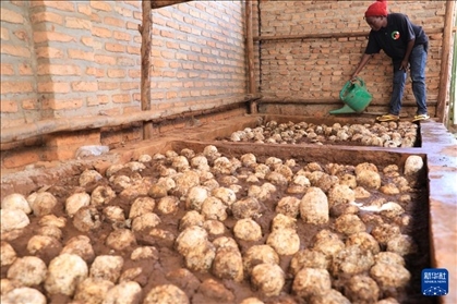 4月6日,在盧旺達南方省穆漢加市附近,尼揚博·奧貝德在工坊查看培育的蘑菇。 新華社記者 董江輝 攝