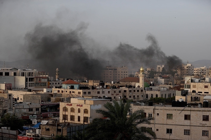 △當?shù)貢r間5月22日,約旦河西岸杰寧難民營遭襲后,濃煙滾滾。