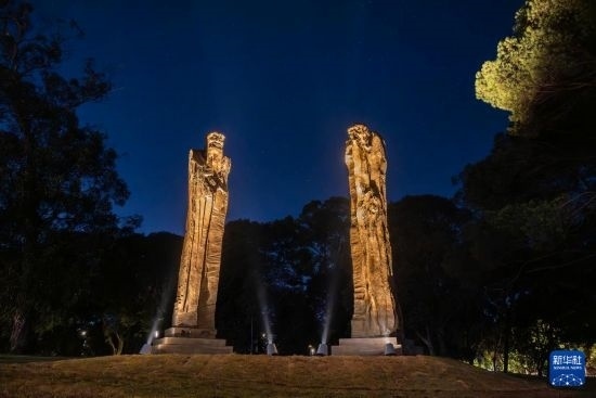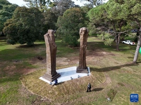 這是5月29日在烏拉圭首都蒙得維的亞市中心的巴特列公園拍攝的雕塑作品《問道》(無人機(jī)照片)。新華社發(fā)(尼古拉斯·塞拉亞攝)