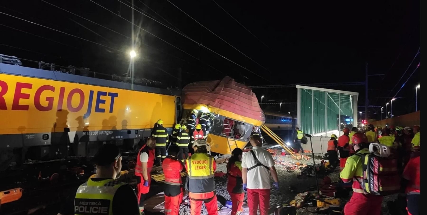 事發(fā)后,數(shù)十名警察、消防和救援人員趕赴現(xiàn)場。捷克“今日”新聞網(wǎng)站發(fā)布的現(xiàn)場視頻顯示,客運(yùn)列車至少一節(jié)車廂脫軌側(cè)翻;警方通過社交媒體發(fā)布的圖片顯示,數(shù)輛應(yīng)急服務(wù)車和一架直升機(jī)參與救援。