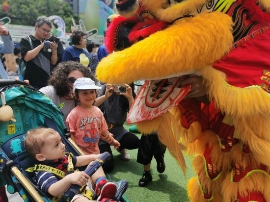 6月9日,端午小長假第二天,在上海金橋的一處商業(yè)中心里,外國小朋友近距離觀看傳統(tǒng)舞獅。新華社記者 陳愛平 攝