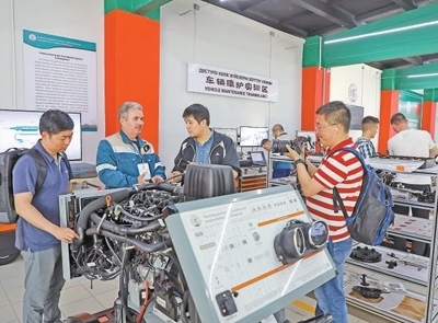 哈薩克斯坦魯班工坊位于東哈薩克斯坦州首府厄斯克門,由天津職業(yè)大學(xué)與東哈薩克斯坦技術(shù)大學(xué)共同承建。圖為在魯班工坊車輛維護(hù)實(shí)訓(xùn)區(qū),聯(lián)合采訪團(tuán)隊(duì)正在對哈方技術(shù)人員進(jìn)行采訪。本報(bào)記者 趙益普攝