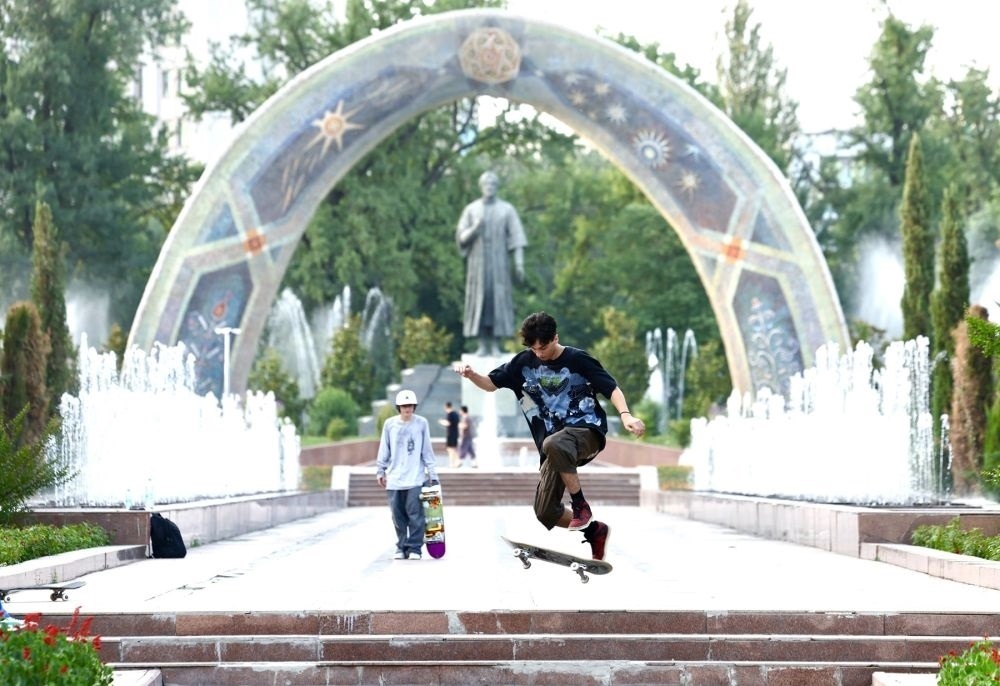 ↑青少年在杜尚別的魯達基公園練習滑板。 新華社記者 姚大偉 攝
