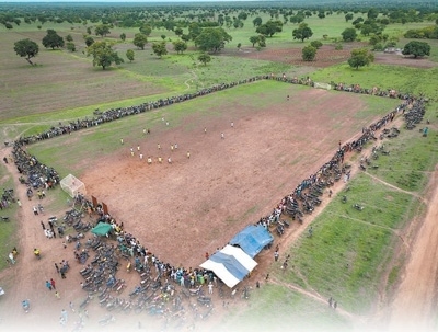 由中國(guó)援貝寧棉花技術(shù)援助項(xiàng)目組修建的足球場(chǎng)(無(wú)人機(jī)照片)。新華社記者 李亞輝攝