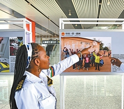 3月22日,在肯尼亞首都內(nèi)羅畢,當(dāng)?shù)厝嗽诿蓛?nèi)鐵路內(nèi)羅畢火車(chē)站參觀(guān)中非共建“一帶一路”務(wù)實(shí)合作圖片展。新華社記者 韓 旭攝