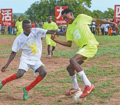 貝寧村民足球賽中,雙方球員正在足球場(chǎng)上拼搶。本報(bào)記者 黃培昭攝