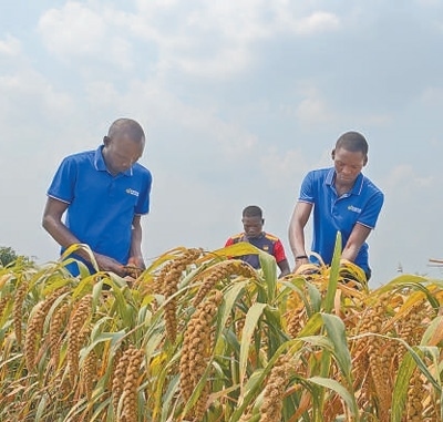 在中國(guó)—烏干達(dá)農(nóng)業(yè)合作產(chǎn)業(yè)園的試驗(yàn)田里,當(dāng)?shù)毓と苏谑斋@中國(guó)狐尾小米。龍文靖攝