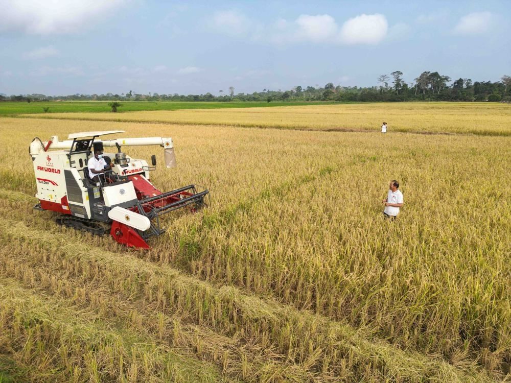 2024年1月8日,在科特迪瓦南部迪沃省格格杜墾區(qū),中國援科農(nóng)業(yè)技術(shù)合作組組長郭長友(右一)指導(dǎo)稻農(nóng)駕駛收割機收割水稻(無人機照片)。格格杜墾區(qū)是中科兩國農(nóng)業(yè)合作示范基地,也是科特迪瓦全國聞名的水稻種植基地。