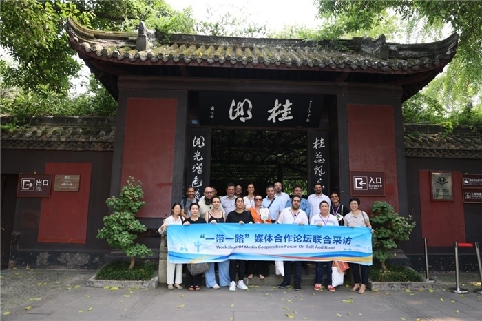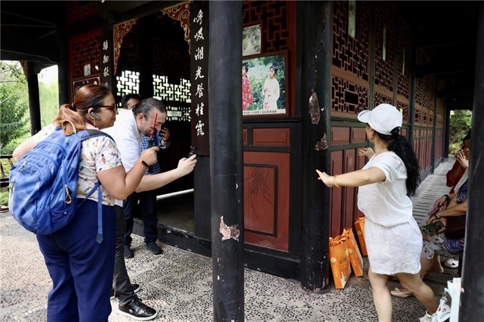 紫藤纏繞,荷葉連綿,位于四川成都新都區(qū)的桂湖公園一片綠意盎然。桂湖公園始建于隋唐時(shí)期,是一座自然環(huán)境幽雅、人文底蘊(yùn)深厚的古典園林。8月30日,2024年“一帶一路”媒體合作論壇拉美媒體采訪團(tuán)來(lái)到這里參觀。