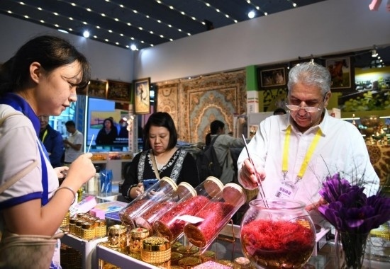 9月20日,來自伊朗的參展商(右一)向觀眾介紹產(chǎn)品。新華社記者 張博文 攝