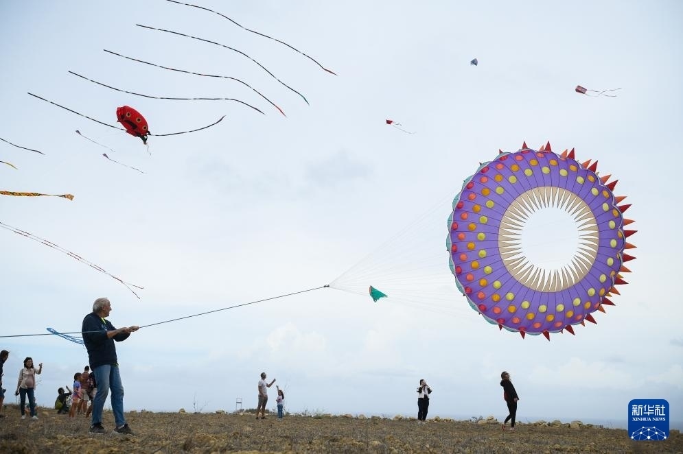 10月19日,在馬耳他戈佐島阿爾卜,人們在第7屆戈佐國際風箏節(jié)上放風箏。