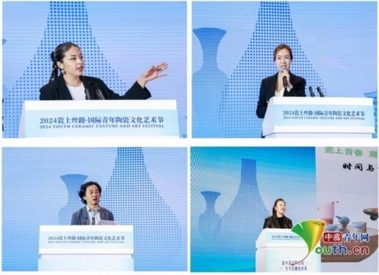 在主題演講環(huán)節(jié),四名陶瓷藝術領域青年藝術家代表分別上臺做了分享。土耳其青年藝術家佩琳因?qū)μ沾晌幕纳詈衽d趣而來到景德鎮(zhèn),她分享了自己對陶瓷文化的思考與理解,她認為“陶瓷藝術飽含著人們對文化多樣性繁榮發(fā)展、美美與共的美好期許”。韓國青年藝術家宋耎姝以自己的作品《銀之?!窞槔?,和大家分享了創(chuàng)作感悟,她認為“陶瓷藝術創(chuàng)作應當關注人與自然的和諧關系,從大自然中汲取養(yǎng)分”。第十二屆全國青聯(lián)委員、江西省青聯(lián)副主席、國家級技能大師工作室領辦人歐陽敏致力于陶瓷文化的傳播,他在分享中強調(diào),“陶瓷文化是中華文明與世界文明交流互鑒的橋梁和載體。各國青年應當做文化傳承創(chuàng)新的踐行者,充分挖掘各國歷史文化的獨特魅力和時代價值,把傳統(tǒng)文化與潮流文化融匯在陶瓷藝術的創(chuàng)作中,為共同推動人類文明發(fā)展進步貢獻青春力量?!本暗骆?zhèn)學院陶瓷美術與設計藝術學院院長張博以《陶瓷藝術在空間中的應用》為題,分享了陶瓷文化所代表的中華傳統(tǒng)文化如何與當代潮流文化相結合,共同繪制出一幅幅五彩斑斕的人類文明畫卷。