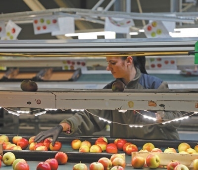 波蘭格魯耶茨縣一家蘋果加工企業(yè)內(nèi),當?shù)毓と苏诜謷O果。本報記者 禹麗敏攝