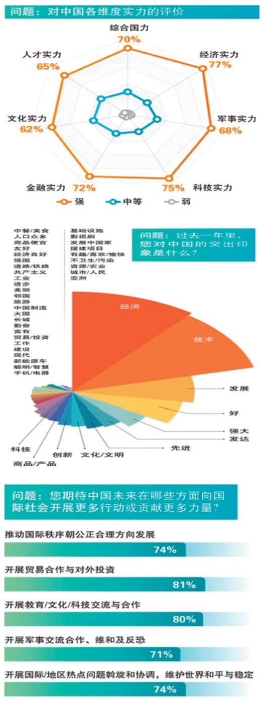 調(diào)查問(wèn)卷讓被訪(fǎng)者自主描繪其過(guò)去一年里對(duì)中國(guó)的突出印象。報(bào)告顯示,各國(guó)民眾使用率最高的關(guān)鍵詞包括“經(jīng)濟(jì)”“技術(shù)/科技”“發(fā)展/發(fā)達(dá)”“好”“強(qiáng)大/強(qiáng)國(guó)”“先進(jìn)/創(chuàng)新”“文化/文明”“商品/產(chǎn)品”“人口眾多”“中餐/美食”等。在發(fā)達(dá)國(guó)家、歐洲國(guó)家、中東國(guó)家和東盟國(guó)家,“經(jīng)濟(jì)”被提及的頻次居首;在發(fā)展中國(guó)家、非洲國(guó)家、金磚國(guó)家,“技術(shù)”被提及的頻次最高。