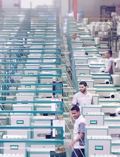 工作人員在巨石埃及玻璃纖維生產(chǎn)基地絡(luò)紗車(chē)間操作設(shè)備。