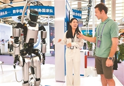 在浙江省寧波國(guó)際會(huì)展中心的第十四屆智博會(huì)現(xiàn)場(chǎng),一位外國(guó)朋友采訪(fǎng)人形機(jī)器人展商。