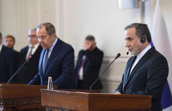 2025年2月25日,在伊朗德黑蘭,伊朗外交部長阿拉格齊(右)與俄羅斯外長拉夫羅夫出席聯(lián)合新聞發(fā)布會。新華社記者沙達(dá)提攝