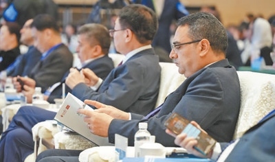 與會(huì)嘉賓在2025上合組織國(guó)家媒體合作論壇上,閱讀《共同的家園——上合組織成員國(guó)發(fā)展愿景民意調(diào)查報(bào)告》。