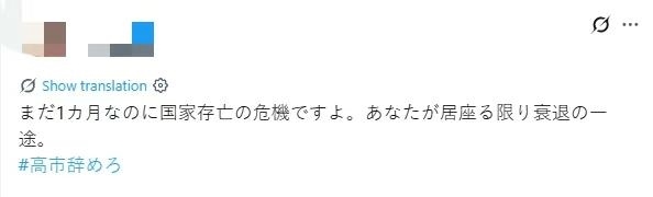 還有網(wǎng)友批評稱,高市上臺僅僅一個月,日本就面臨國家生存危機(jī),如果高市繼續(xù)當(dāng)首相,國家會走向衰落。