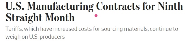 《華爾街日報》1日發(fā)表文章稱,美國供應管理協(xié)會(ISM)當天公布的調查報告顯示,11月美國制造業(yè)采購經理人指數(PMI)已低于50的榮枯分界線。美國制造業(yè)活動連續(xù)第九個月萎縮,而美國制造商認為這主要是因為美國政府的關稅政策。