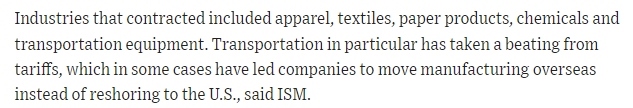 文章指出,美國制造業(yè)活動萎縮的行業(yè)主要包括服裝、紡織品、紙制品、化工產品和運輸業(yè)。文章表示,雖然當前美國工廠產量有所增加,但未售出的庫存卻急劇增加。需求增長放緩,這在出口市場體現(xiàn)尤為明顯,而受關稅影響,出口市場的前景更加暗淡。