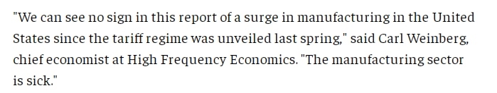 文章指出,美國政府曾辯稱,加征關稅是保護美國國內制造業(yè)的必要之舉,但經濟學家則認為,由于包括勞動力短缺在內的結構性問題,美國制造業(yè)已無法恢復昔日輝煌。文章援引高頻經濟咨詢公司首席經濟學家卡爾·溫伯格(Carl Weinberg)的話表示,“從(ISM)這份報告中,我沒有看到自關稅政策出臺以來,美國制造業(yè)出現(xiàn)任何增長的跡象,美國制造業(yè)已經病了?!?/p>