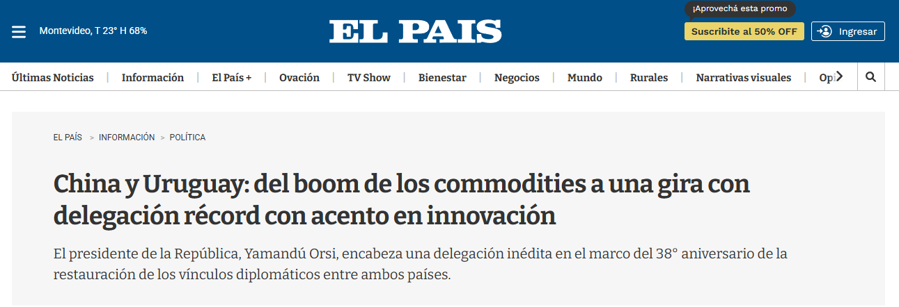 南美新聞機構(gòu)Merco Press報道稱,此次訪問正值烏拉圭與中國建交38周年,烏拉圭總統(tǒng)奧爾西率領(lǐng)約150人的代表團啟程訪華,旨在“加強與烏拉圭最大貿(mào)易伙伴之間的經(jīng)濟聯(lián)系”。