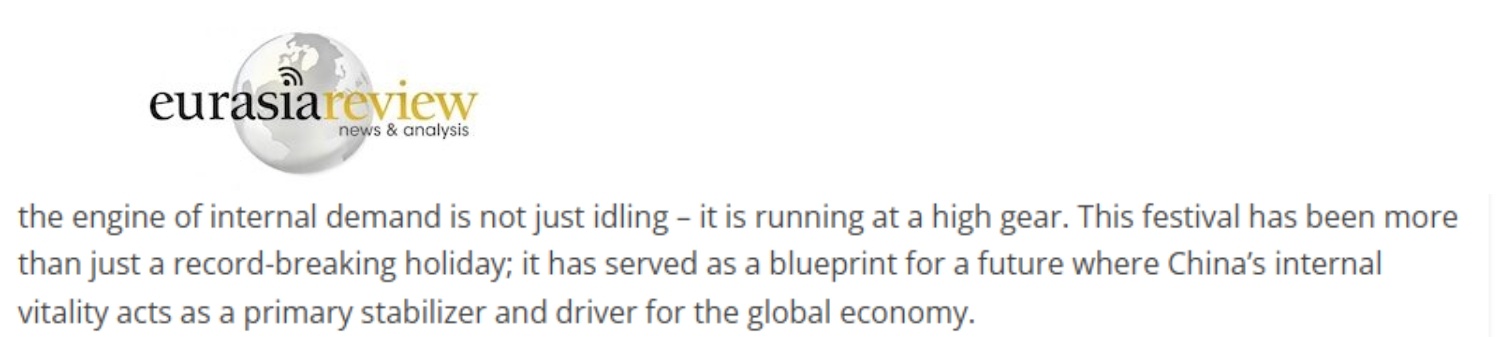 文章最后說,春節(jié)消費(fèi)熱潮表明,內(nèi)需引擎非但沒有空轉(zhuǎn),反而在高速運(yùn)轉(zhuǎn)。這個春節(jié)的意義不僅僅在于其破紀(jì)錄的假期數(shù)據(jù),而是在于它繪制了一幅未來藍(lán)圖:中國的內(nèi)在活力將成為全球經(jīng)濟(jì)的主要穩(wěn)定器和驅(qū)動力。
