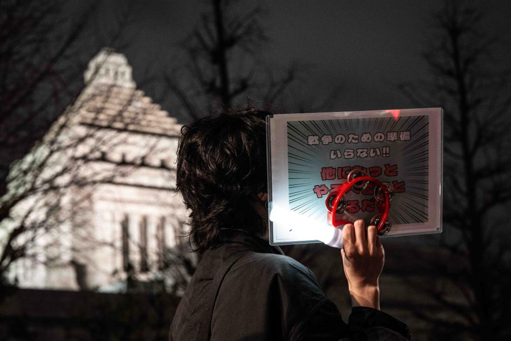 2月24日,在日本東京的眾議院第二議員會館前,民眾手持標(biāo)語參加抗議活動。新華社記者賈浩成攝